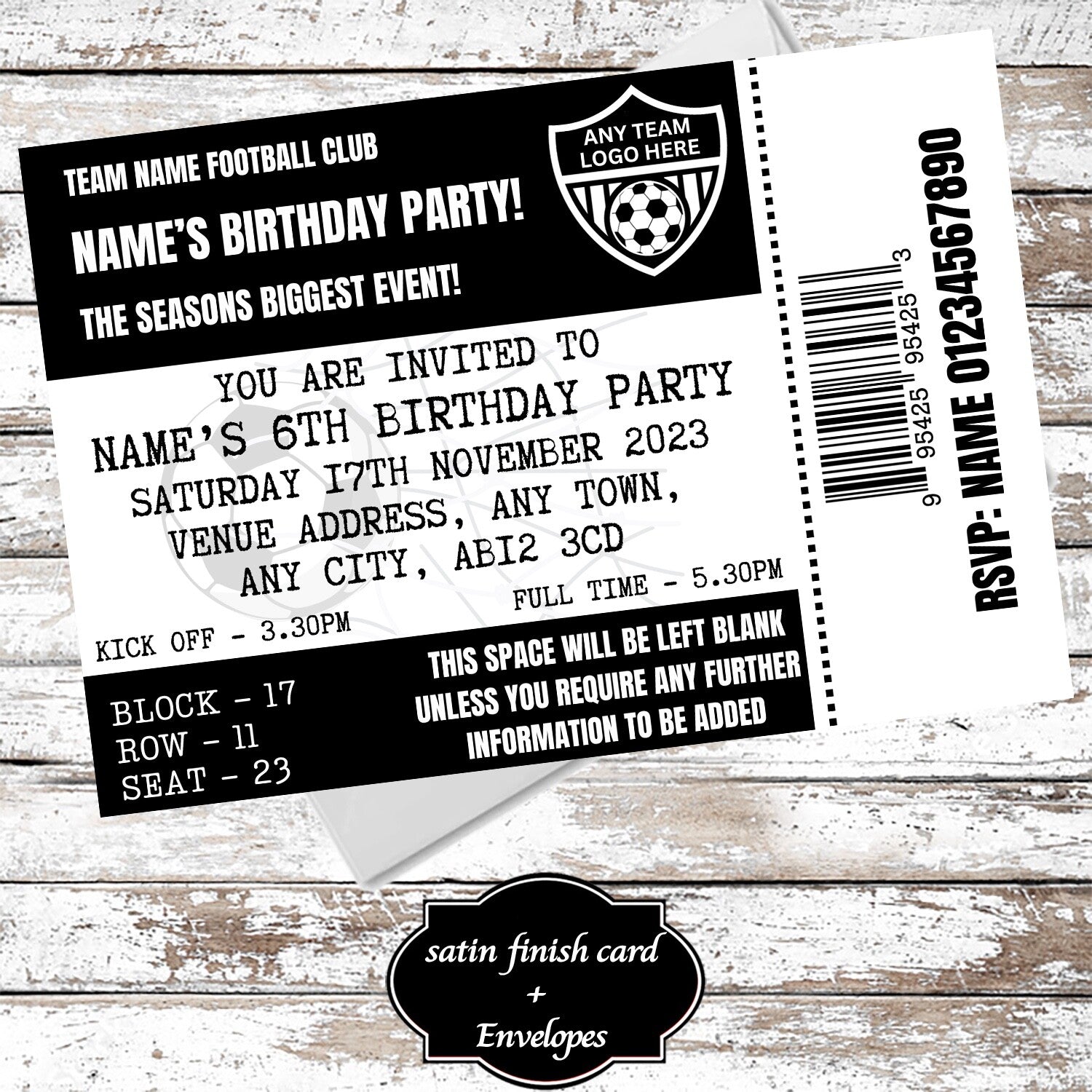 10 Personalised Football Ticket Black & White Party Invitations With Envelopes