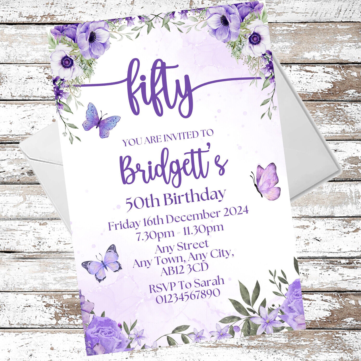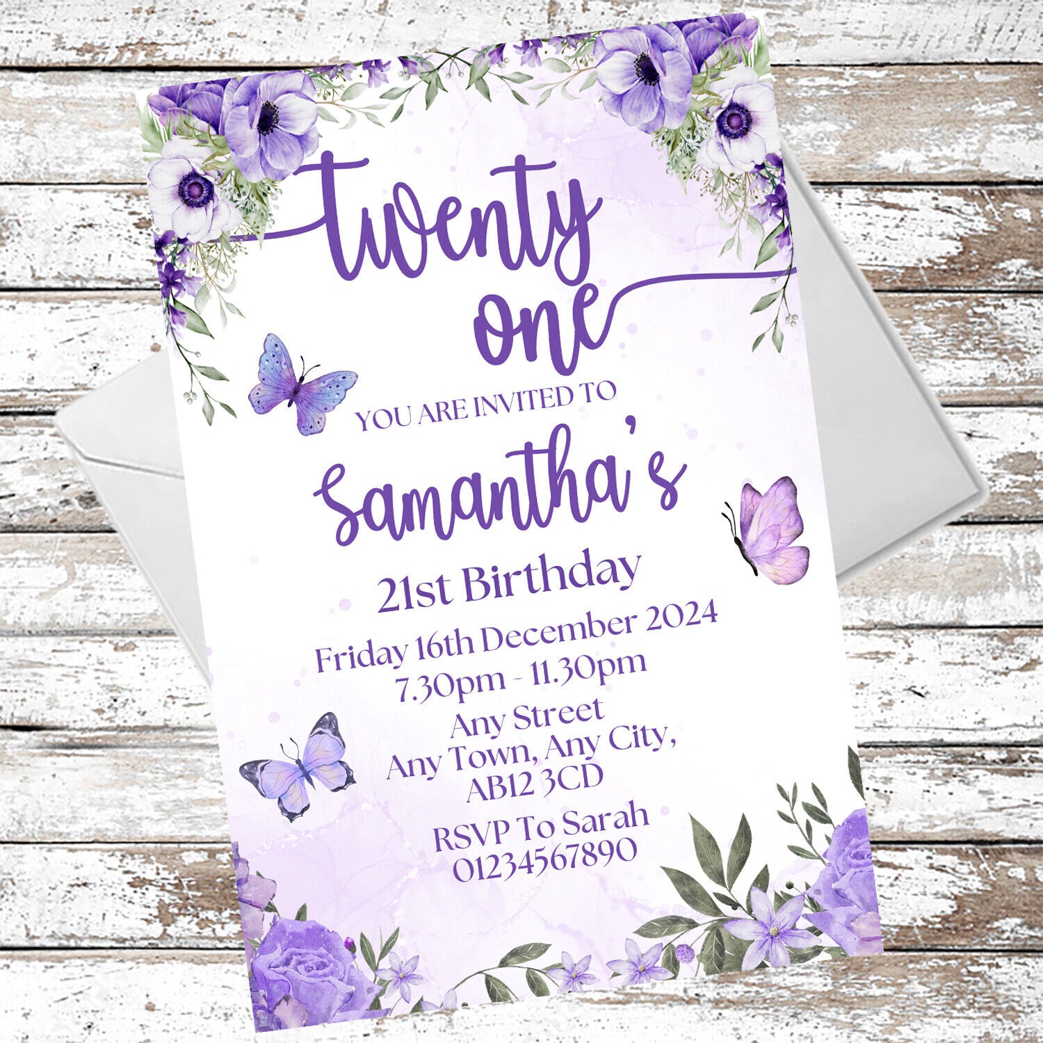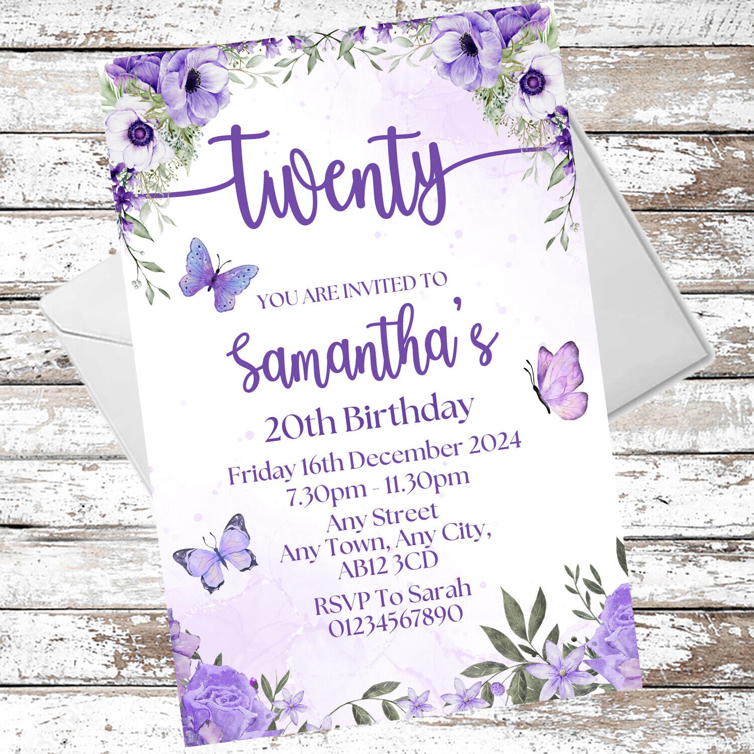 10 Personalised Purple Party Any Age Invitations With Envelopes